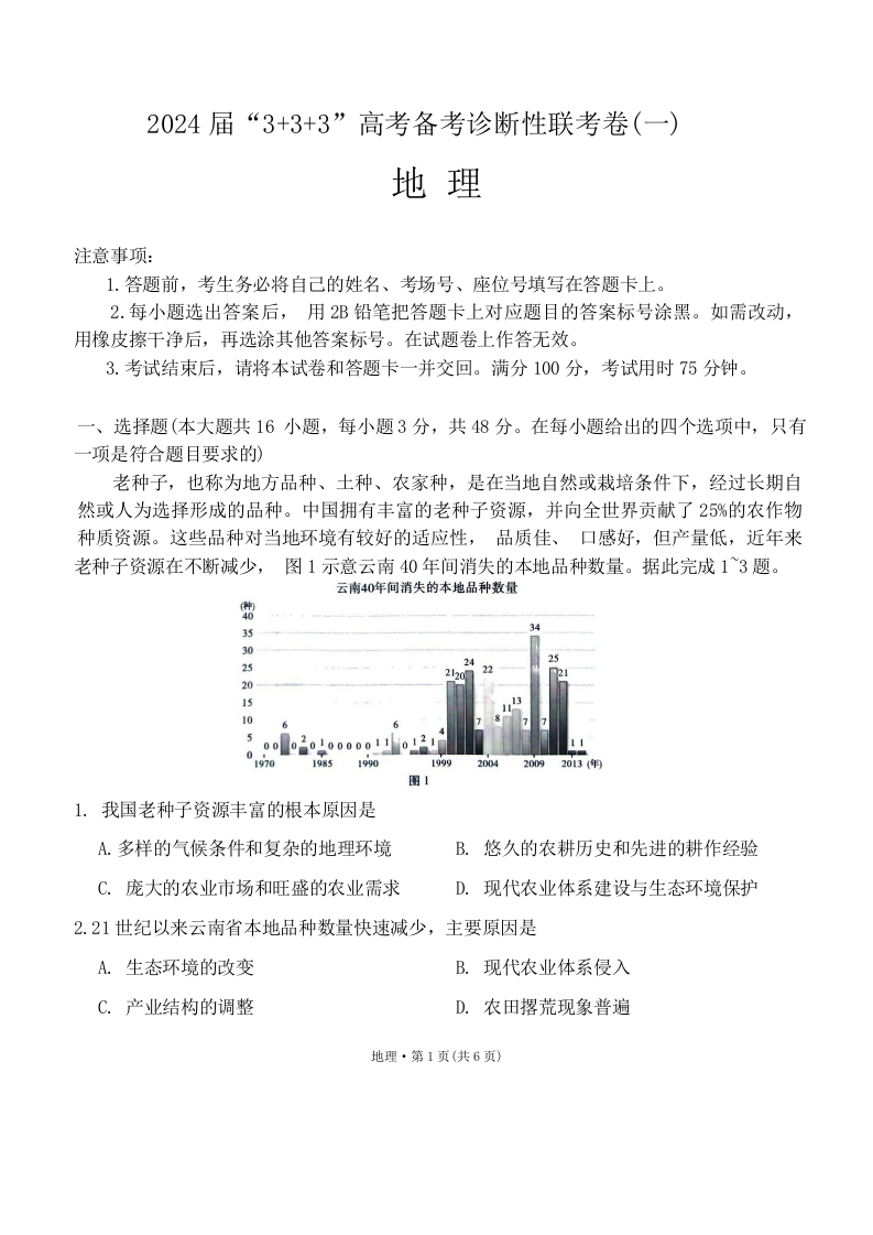 贵州省2024届“3+3+3”高考备考诊断性联考卷(一)地理