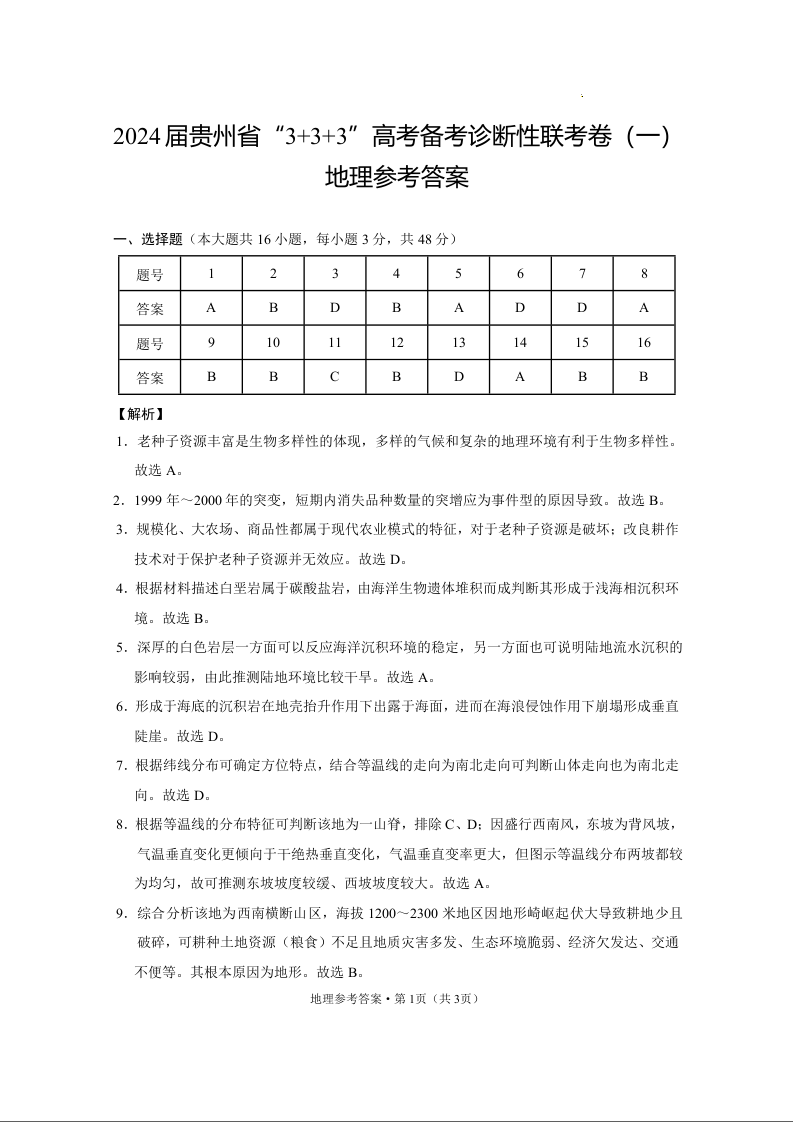 贵州省2024届“3+3+3”高考备考诊断性联考卷(一)地理答案