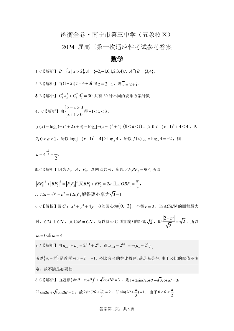 邕衡金卷·广西南宁市第三中学2024届高三第一次适应性考试(12月联考)数学答案