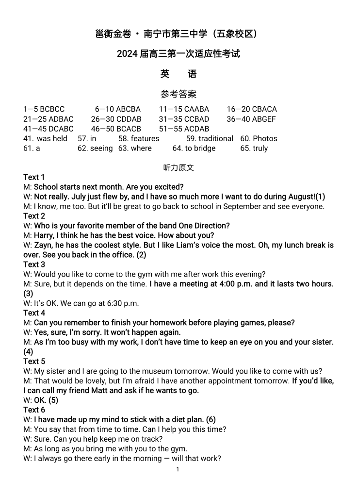 邕衡金卷·广西南宁市第三中学2024届高三第一次适应性考试(12月联考)英语答案