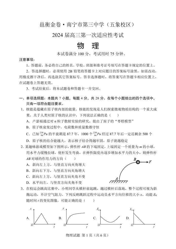 邕衡金卷·广西南宁市第三中学2024届高三第一次适应性考试(12月联考)物理