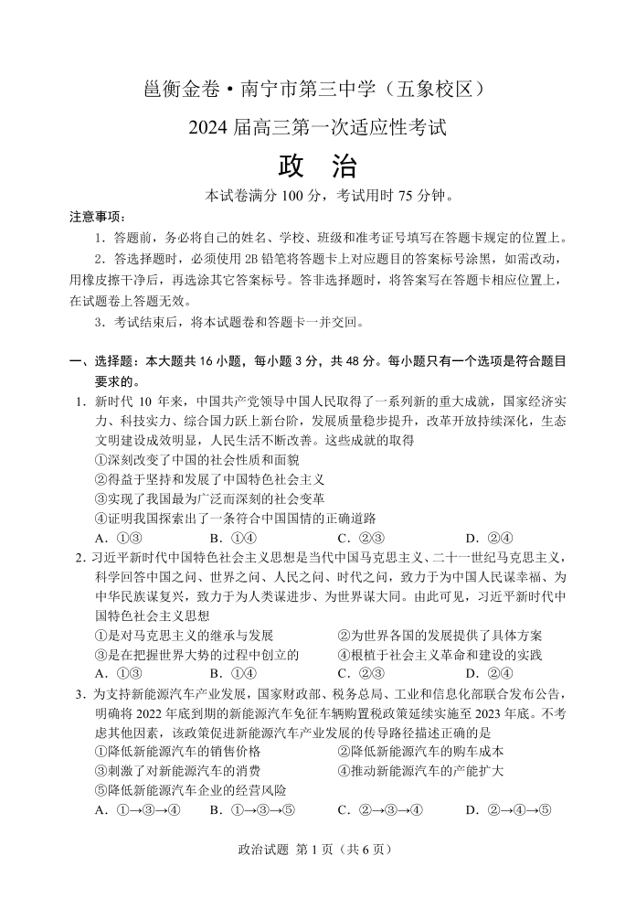 邕衡金卷·广西南宁市第三中学2024届高三第一次适应性考试(12月联考)政治