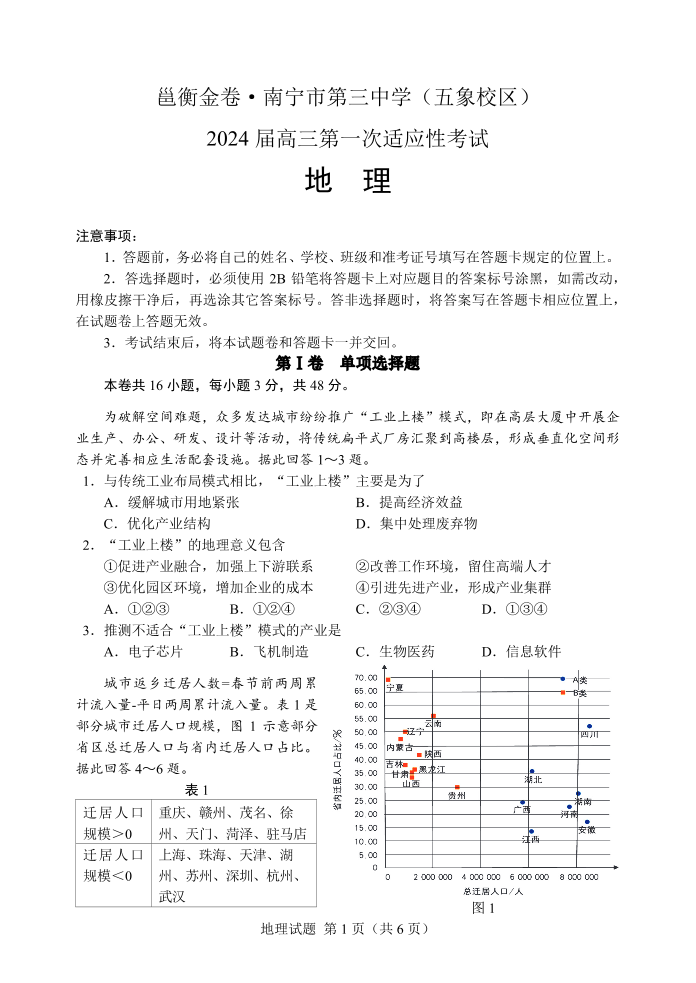 邕衡金卷·广西南宁市第三中学2024届高三第一次适应性考试(12月联考)地理