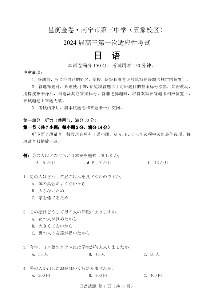 邕衡金卷·广西南宁市第三中学2024届高三第一次适应性考试(12月联考)日语