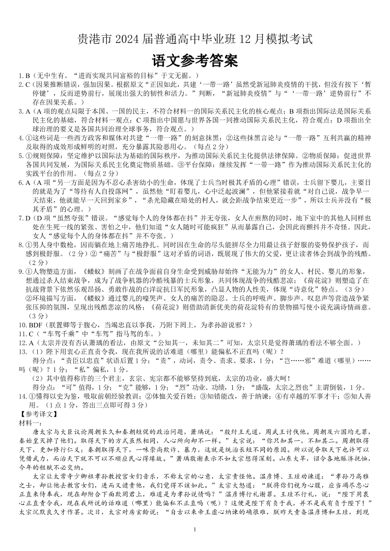 广西省贵港市2024届高三上学期12月模拟考试语文答案