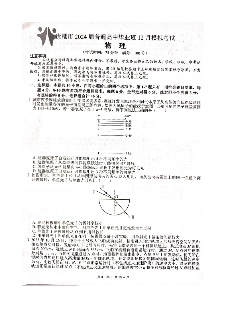 广西省贵港市2024届高三上学期12月模拟考试物理