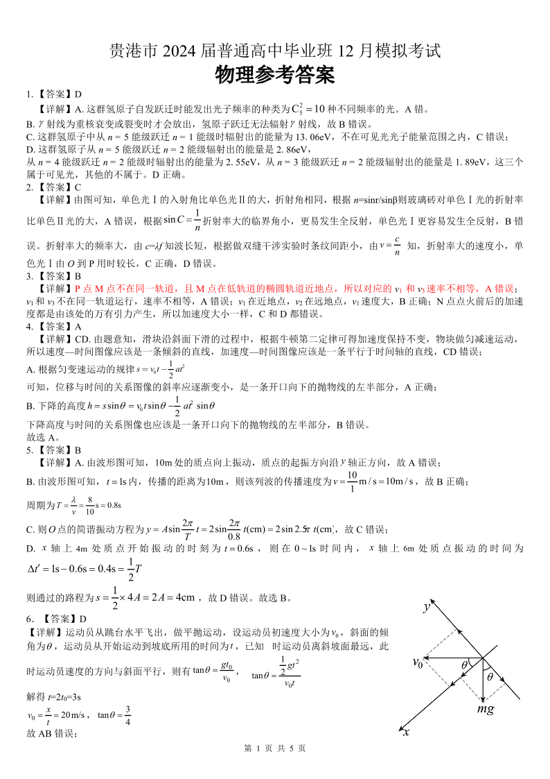 广西省贵港市2024届高三上学期12月模拟考试物理答案