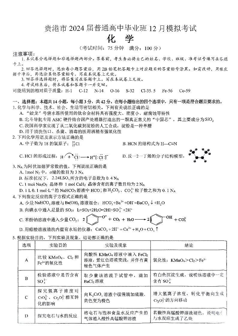 广西省贵港市2024届高三上学期12月模拟考试化学