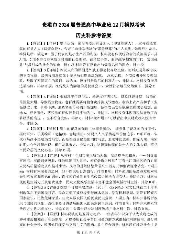 广西省贵港市2024届高三上学期12月模拟考试历史答案