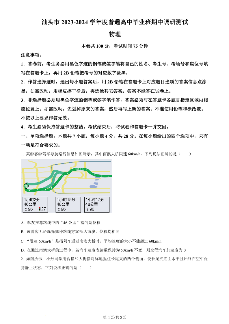 广东省汕头市2024届高三上学期12月期中考试物理(原卷版)