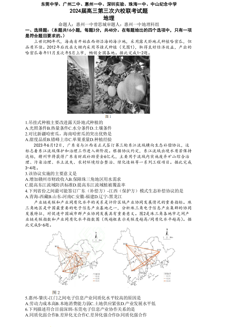 广东省六校2024届高三上学期第三次联考地理+答案