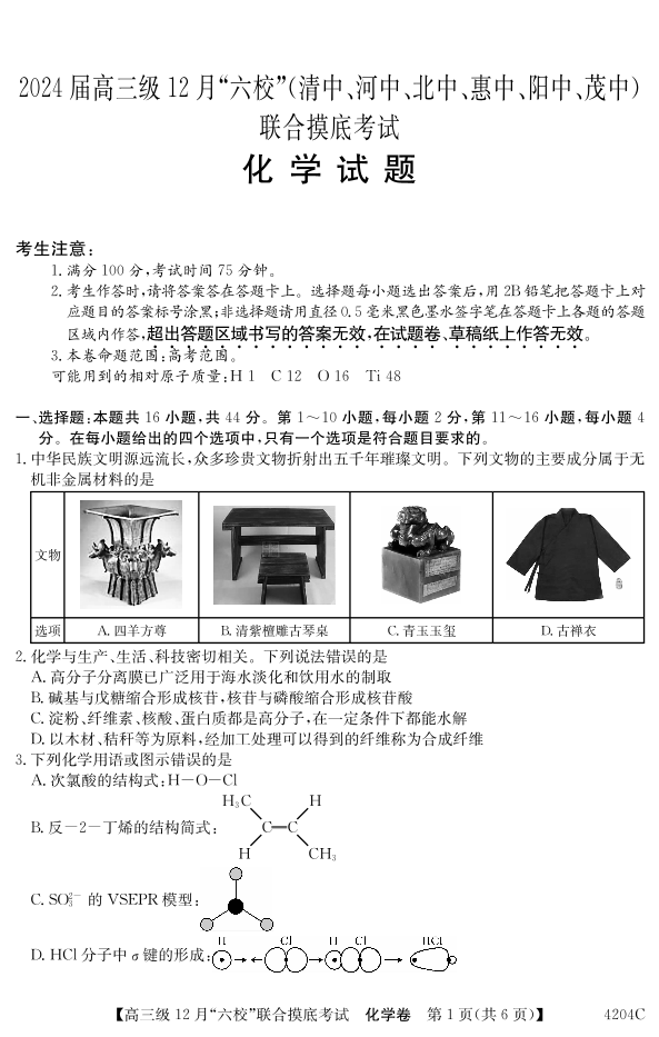 广东省六校2024届高三上学期12月联合摸底考试化学