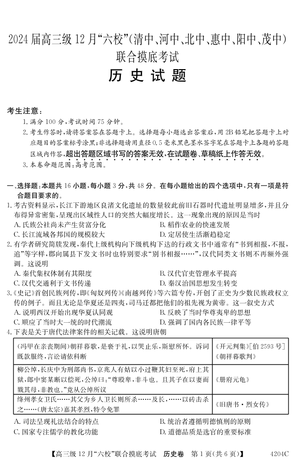 广东省六校2024届高三上学期12月联合摸底考试历史