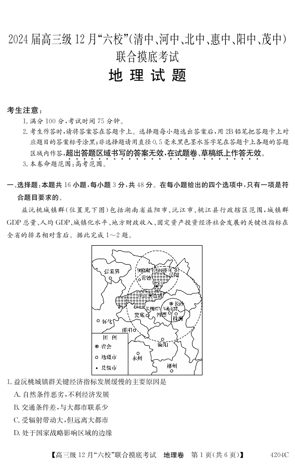 广东省六校2024届高三上学期12月联合摸底考试地理