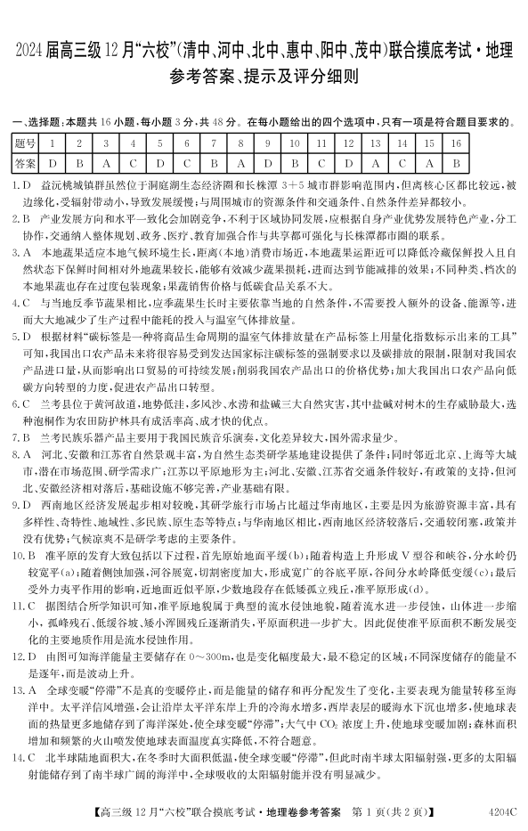 广东省六校2024届高三上学期12月联合摸底考试地理答案