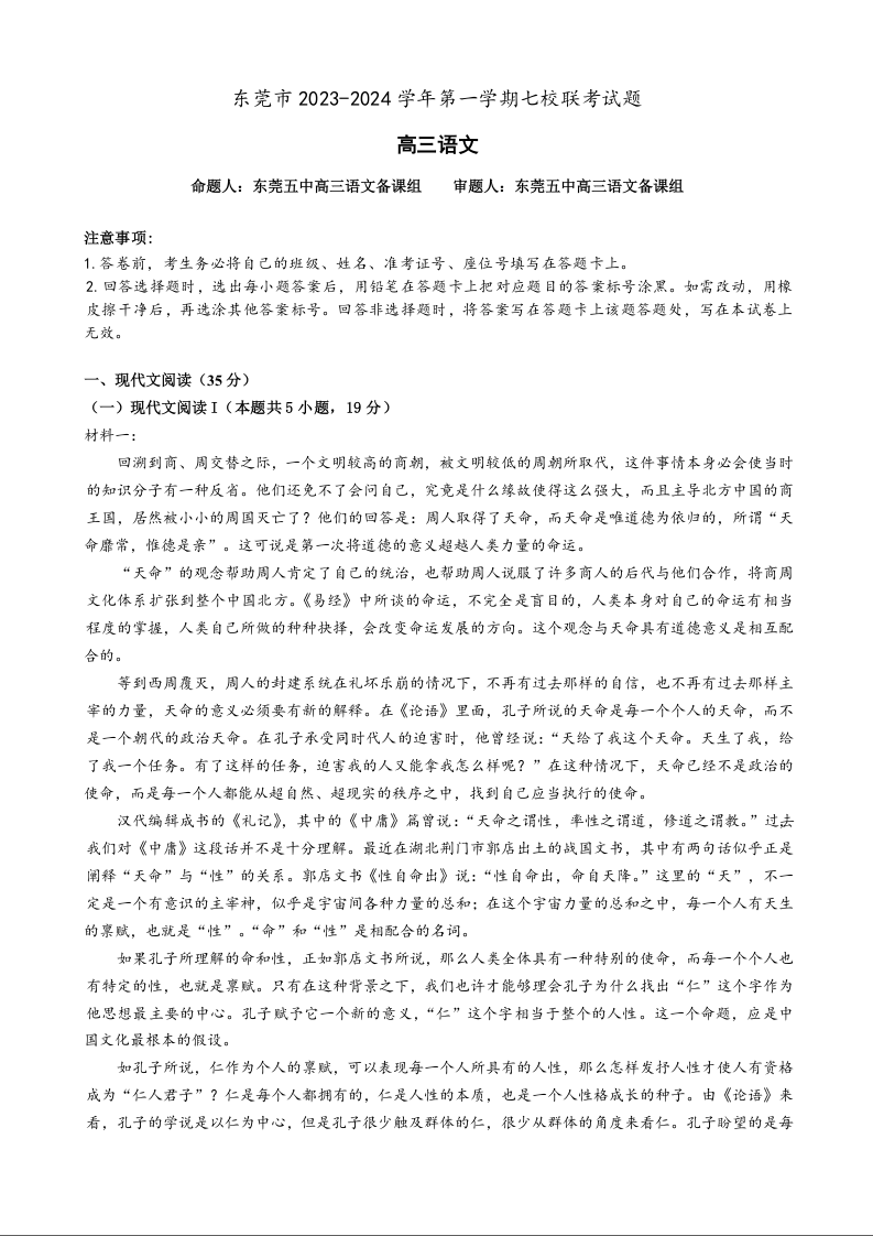 广东省东莞市七校2024届高三上学期联考语文+答案