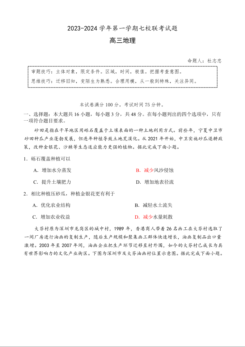 广东省东莞市七校2024届高三上学期联考地理+答案