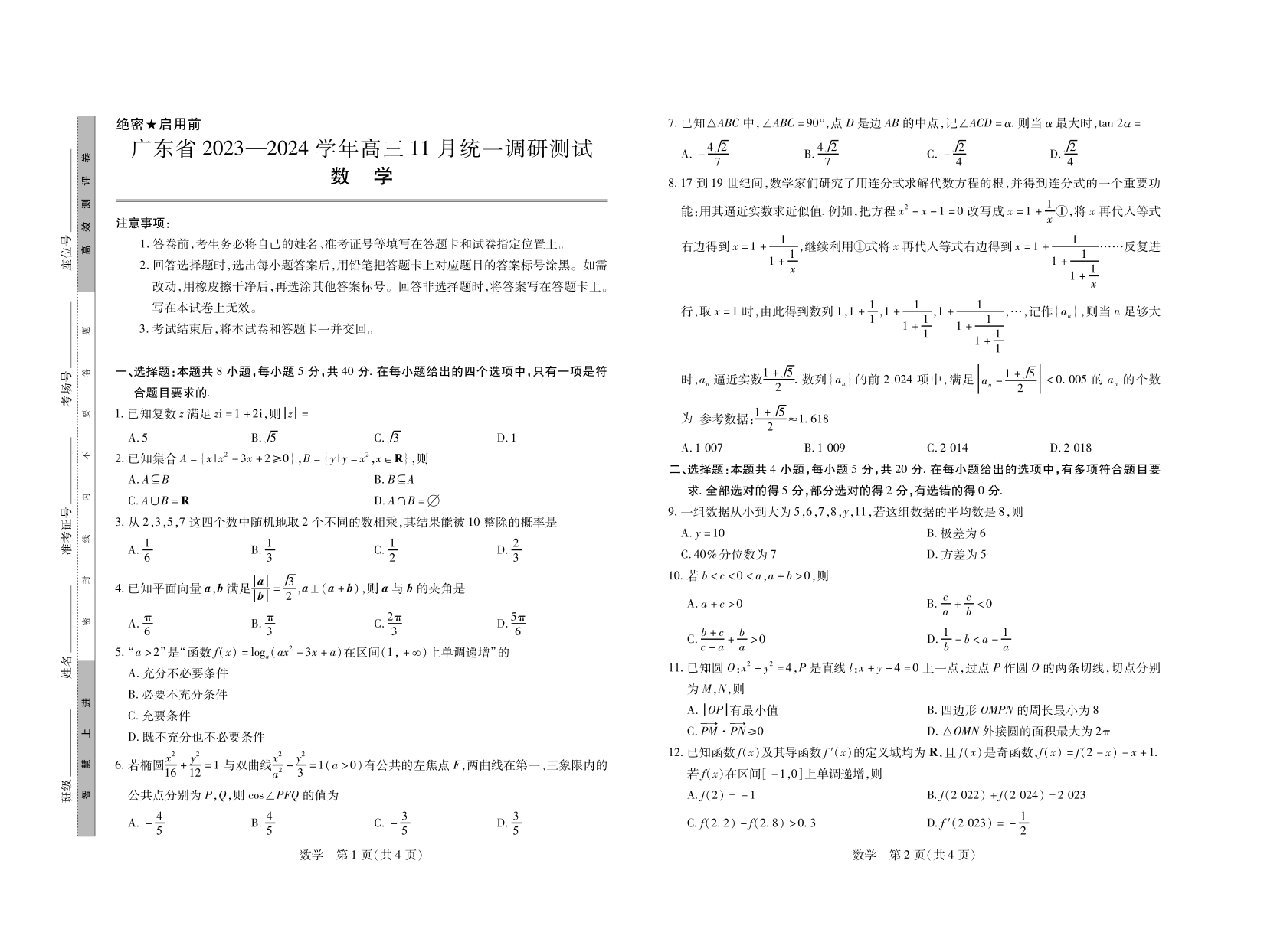 广东省2023-2024学年高三上学期11月统一调研测试数学