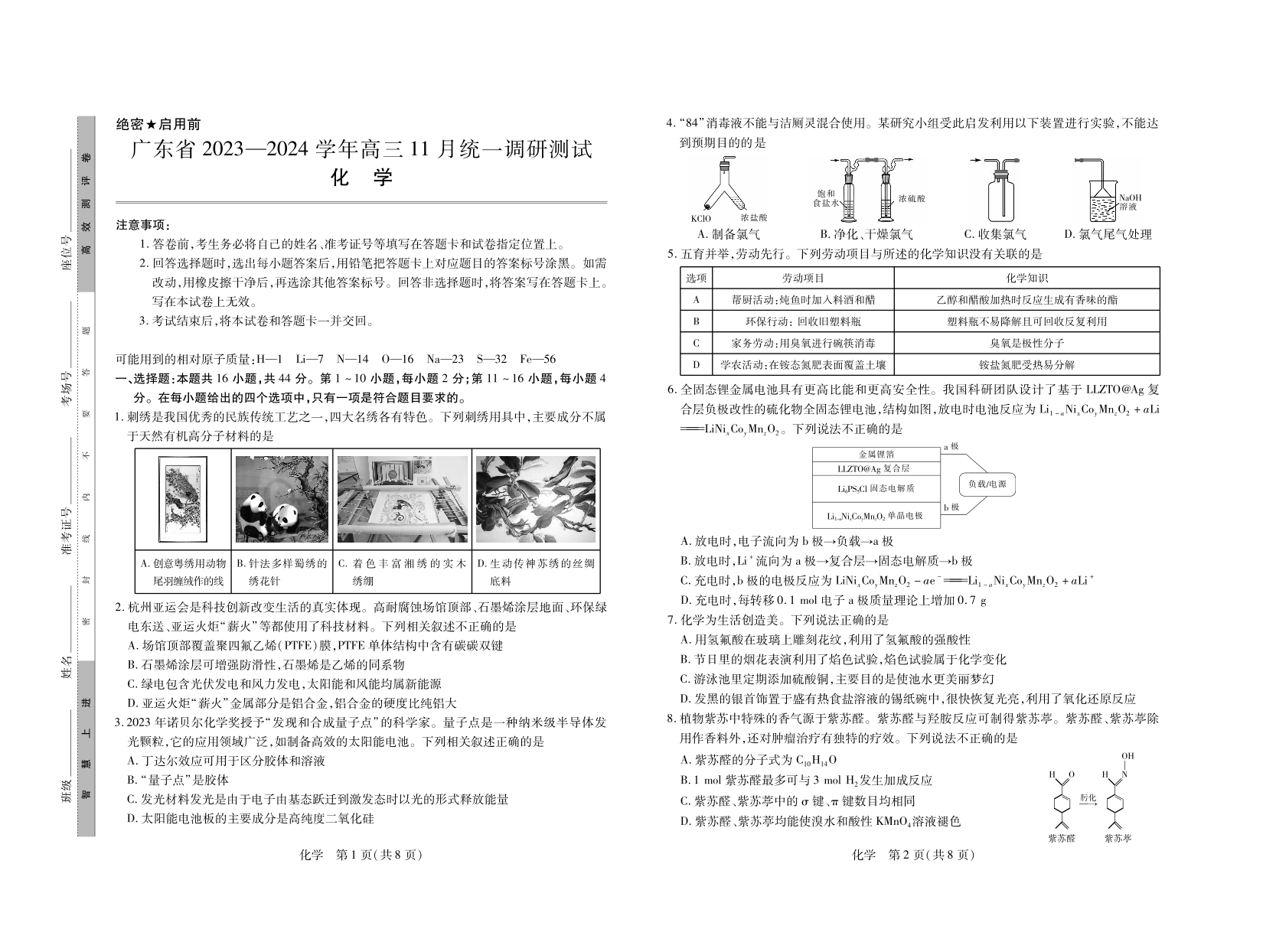 广东省2023-2024学年高三上学期11月统一调研测试化学