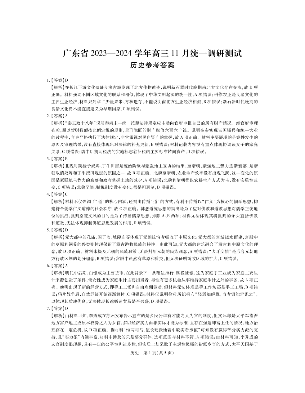 广东省2023-2024学年高三上学期11月统一调研测试历史答案