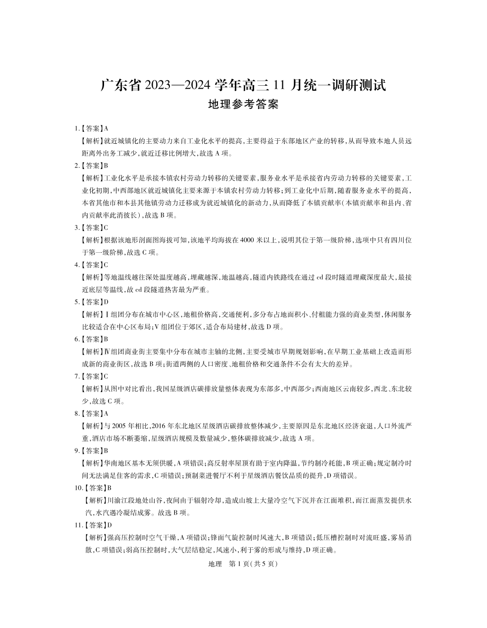 广东省2023-2024学年高三上学期11月统一调研测试地理答案