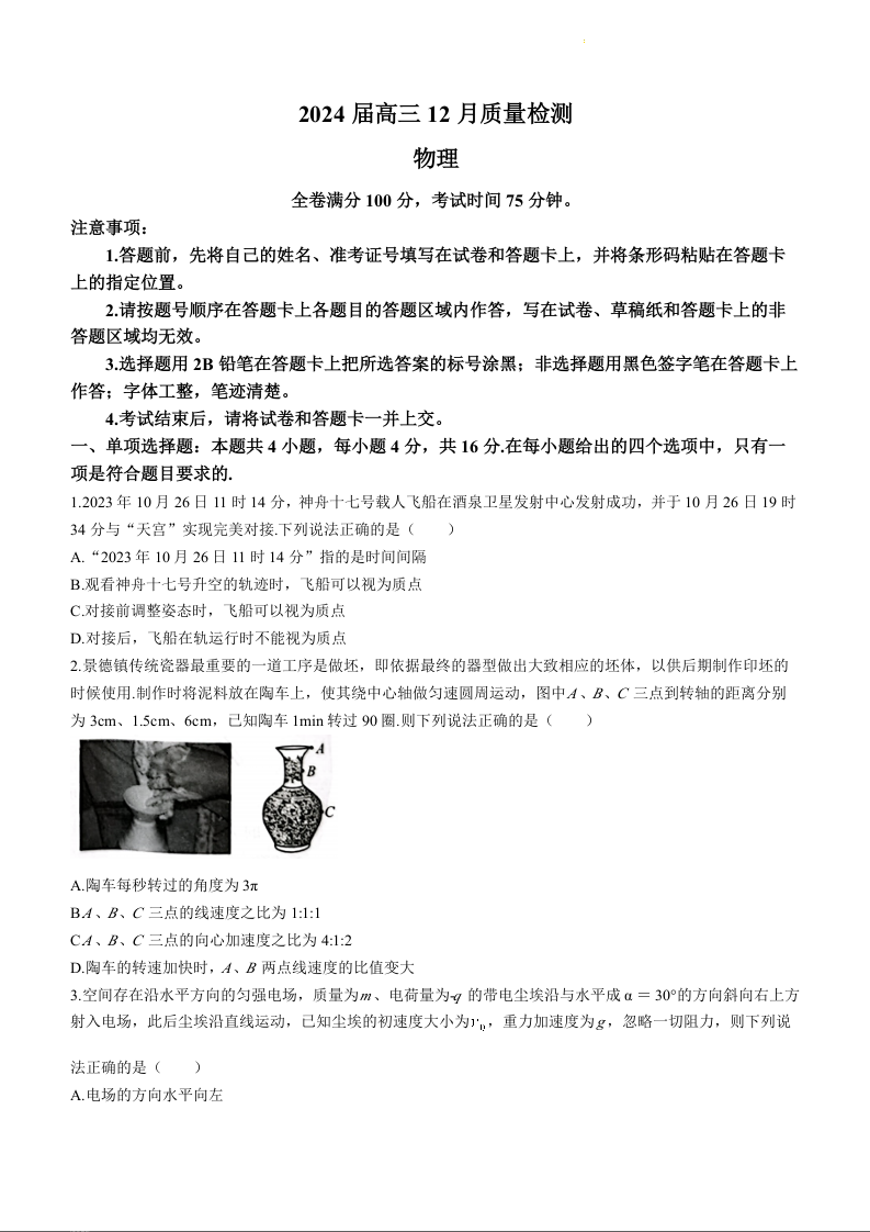 福建省百校联考(金科大联考)2024届高三上学期12月月考物理