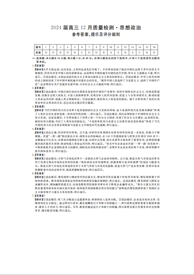 福建省百校联考(金科大联考)2024届高三上学期12月月考政治答案