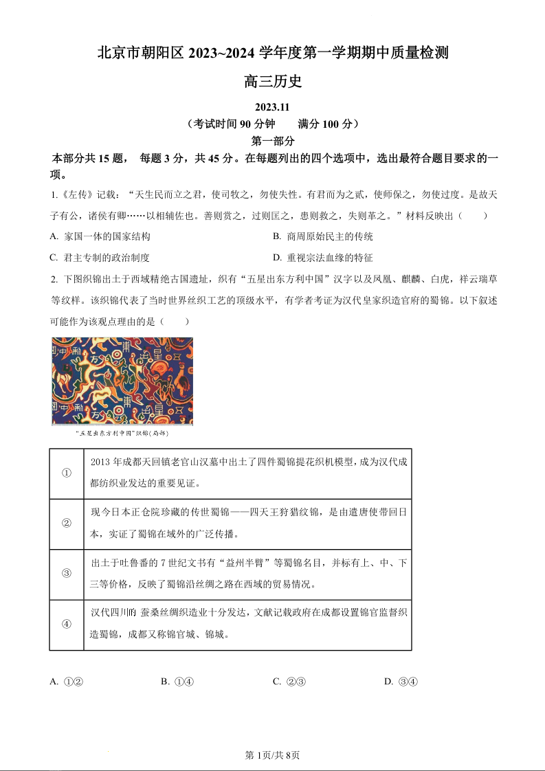 北京市朝阳区2024届高三上学期期中考试历史(原卷版)
