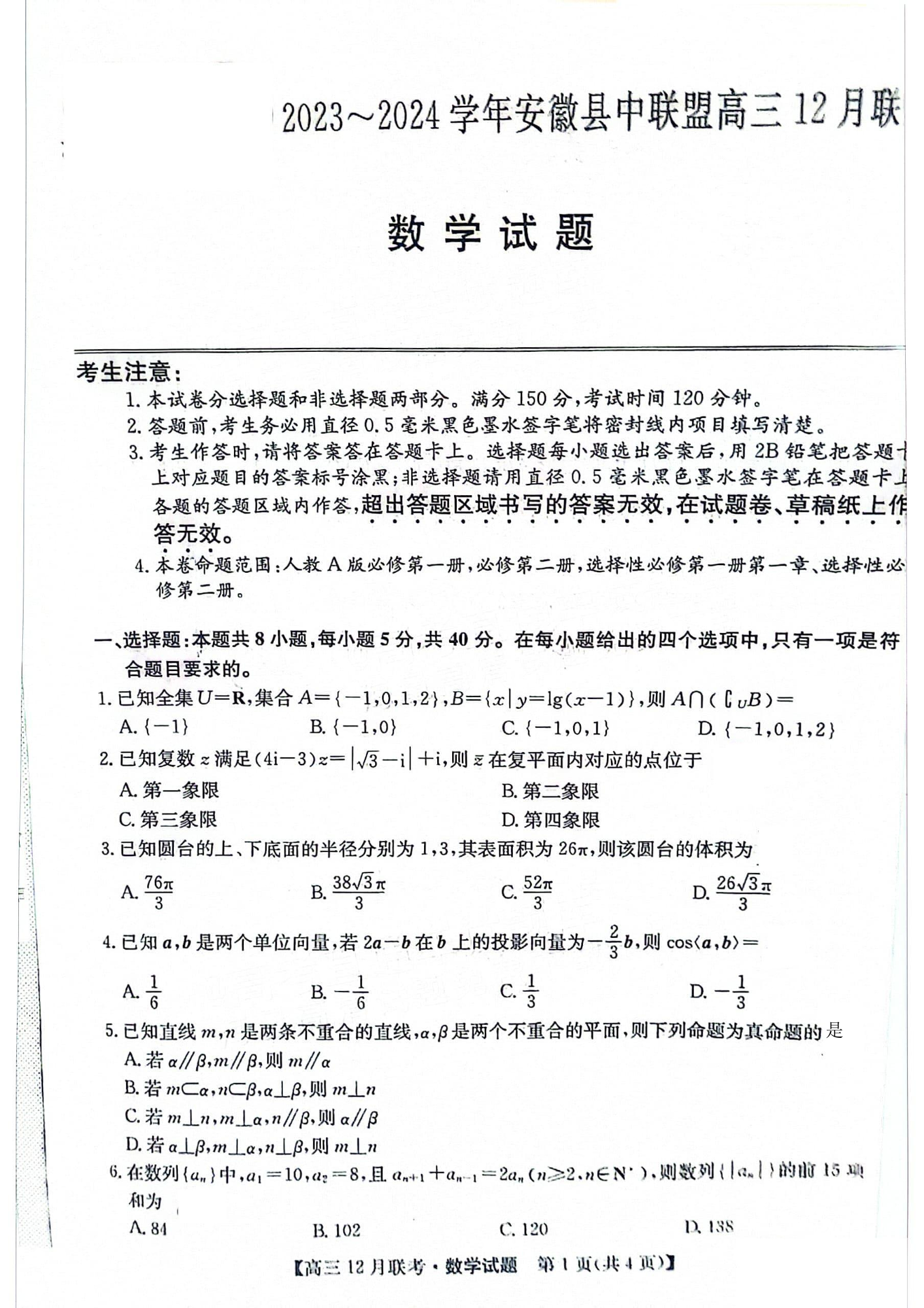 安徽省县中联盟2024届高三上学期12月联考数学+答案