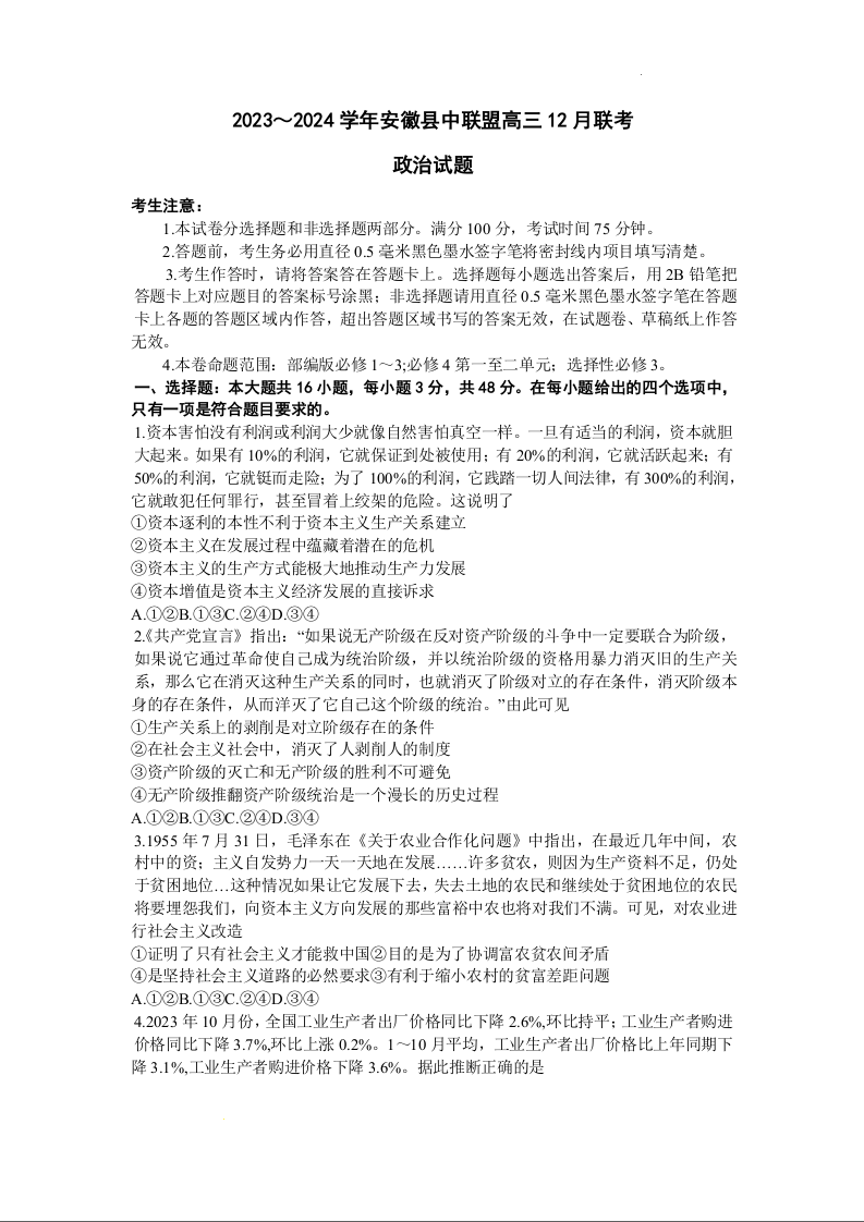 安徽省县中联盟2024届高三上学期12月联考政治+答案