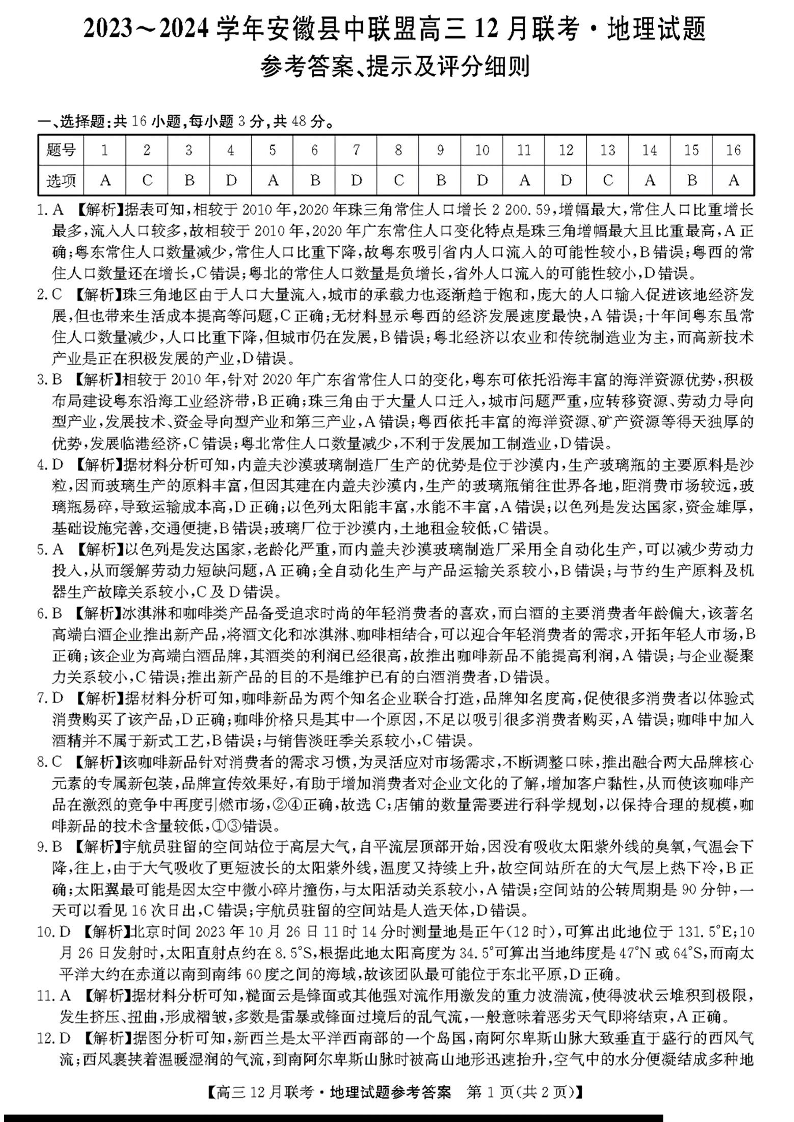 安徽省县中联盟2024届高三上学期12月联考地理答案