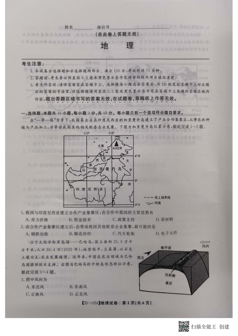 安徽省皖江名校联盟2024届高三上学期12月月考地理