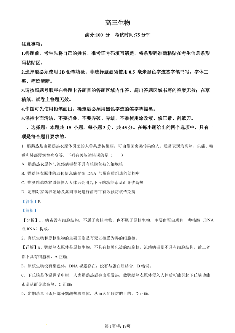 安徽省名校联盟2024届高三12月大联考生物(精品解析版)