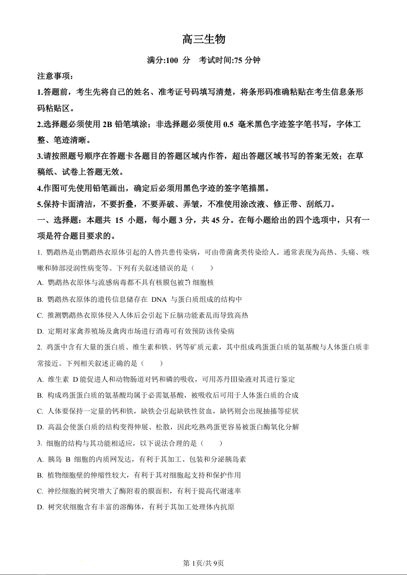 安徽省名校联盟2024届高三12月大联考生物(原卷版)