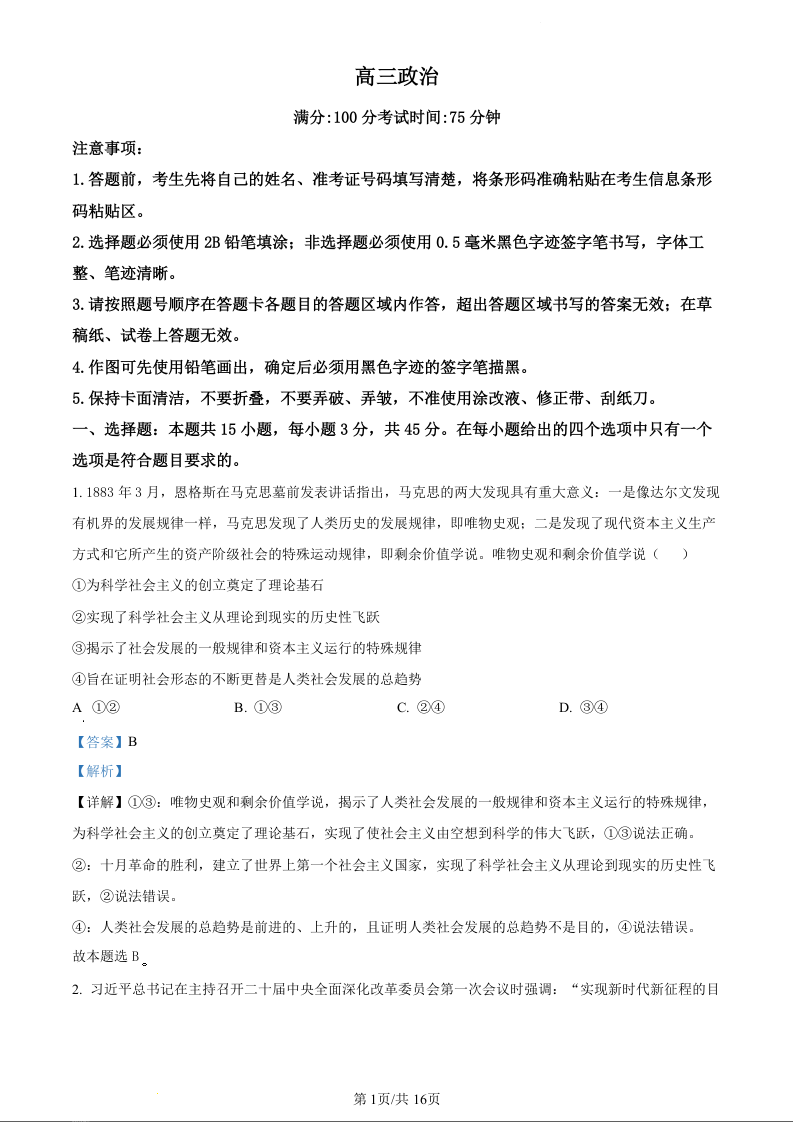 安徽省名校联盟2024届高三12月大联考政治(精品解析版)