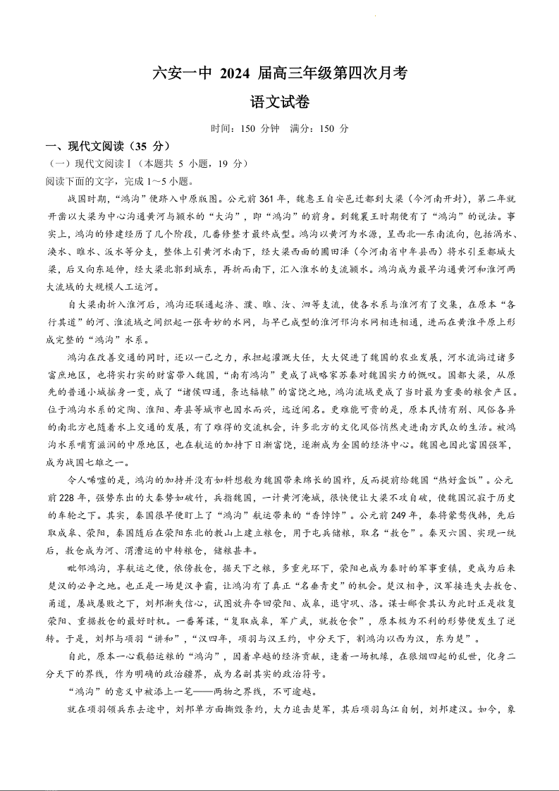 安徽省六安第一中学2024届高三上学期12月月考语文+答案