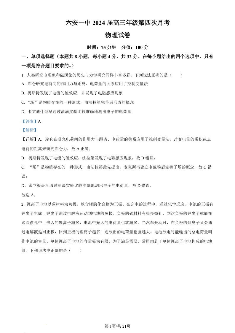 安徽省六安第一中学2024届高三上学期12月月考物理(精品解析版)