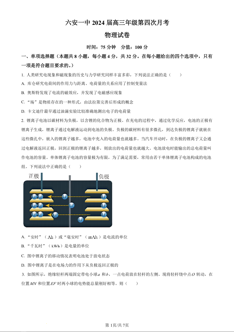 安徽省六安第一中学2024届高三上学期12月月考物理(原卷版)