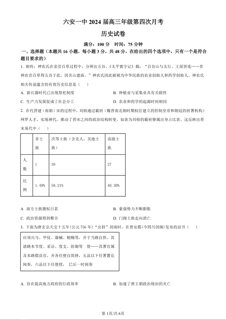 安徽省六安第一中学2024届高三上学期12月月考历史(原卷版)