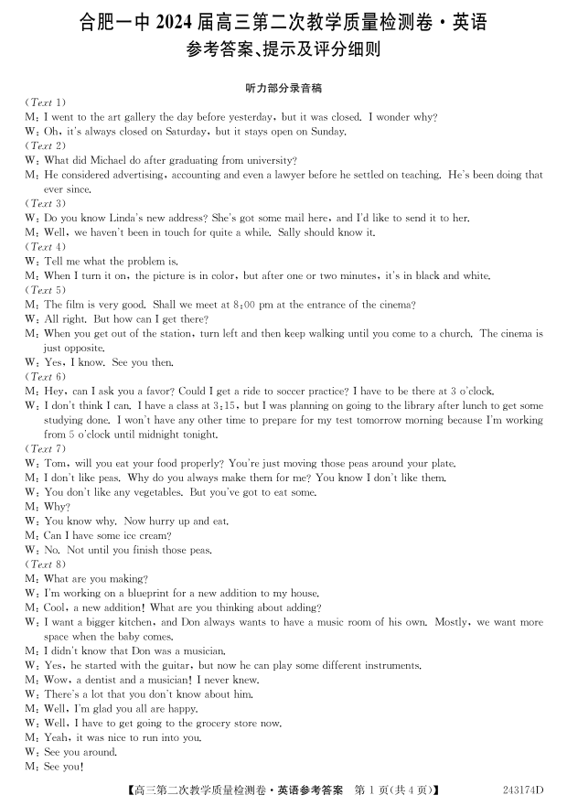 安徽省合肥市一中2024届高三上学期第二次教学质量检测英语答案