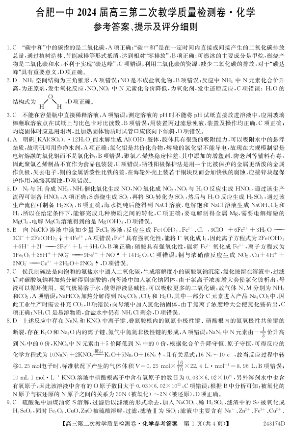 安徽省合肥市一中2024届高三上学期第二次教学质量检测化学答案