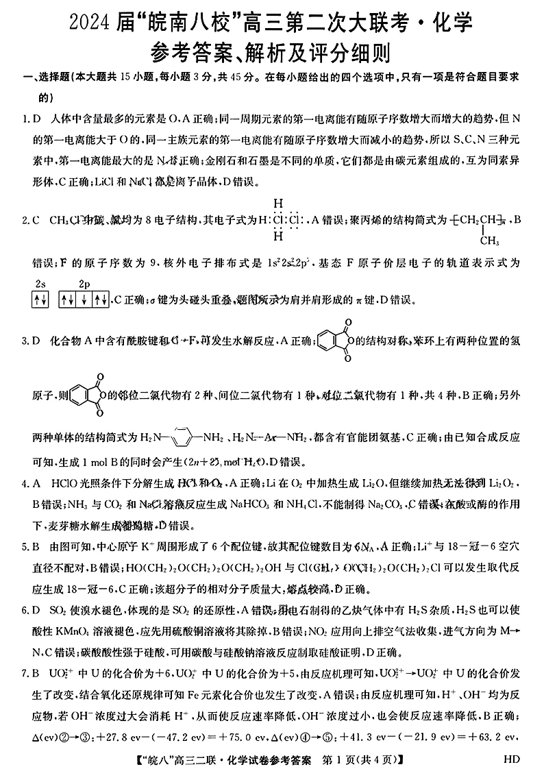 安徽省2024届皖南八校高三第二次大联考化学答案