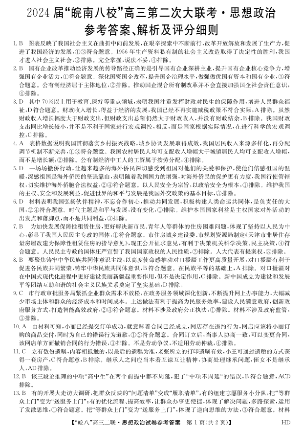 安徽省2024届皖南八校高三第二次大联考政治答案