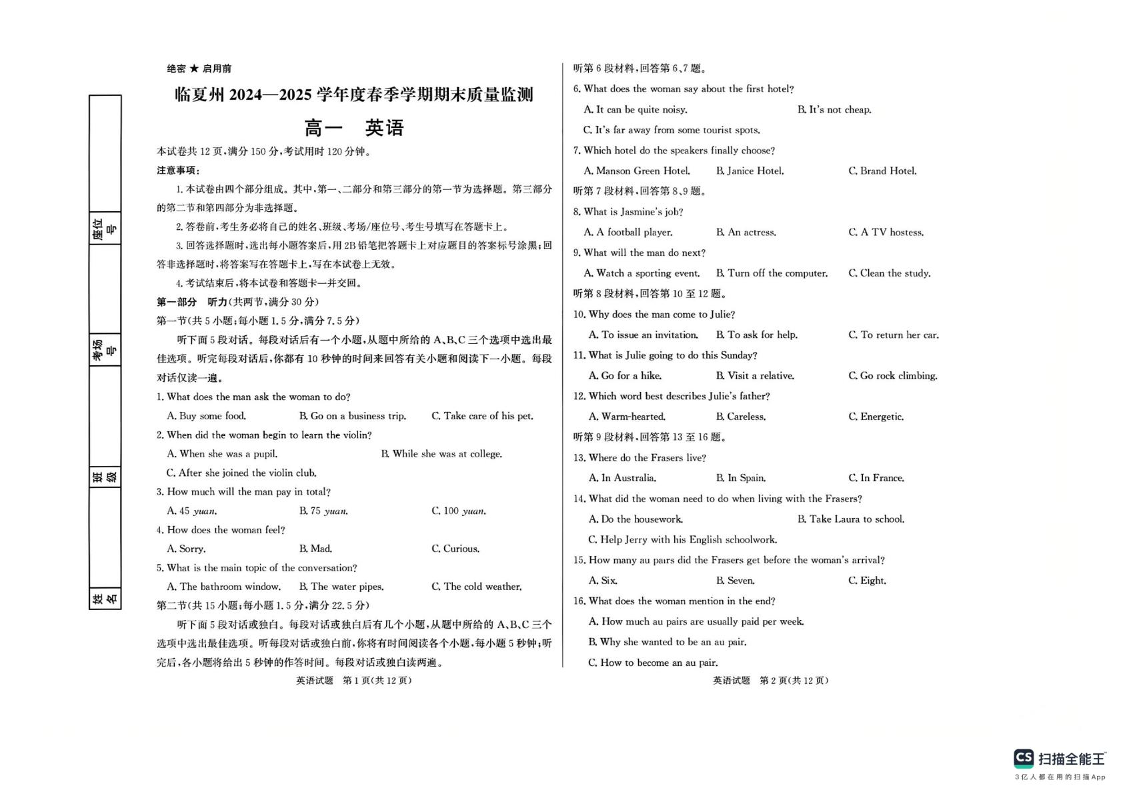 高一英语+答案--甘肃省临夏州2024-2025学年高一下学期期末质量监测
