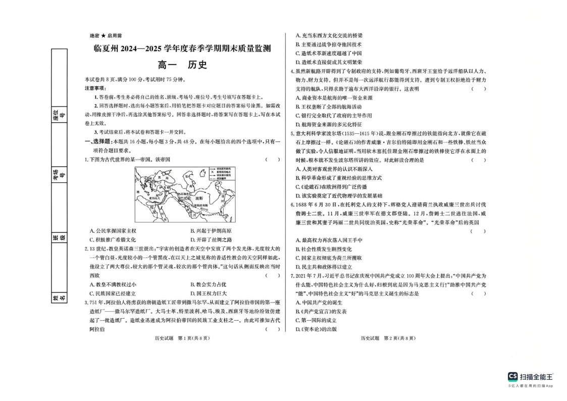高一历史+答案--甘肃省临夏州2024-2025学年高一下学期期末质量监测