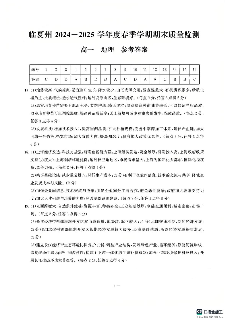 高一地理答案--甘肃省临夏州2024-2025学年高一下学期期末质量监测