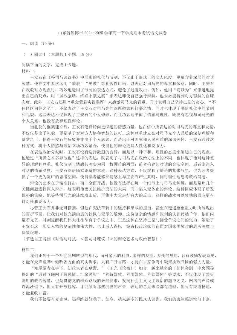 高一语文+答案--山东省淄博市2024-2025学年高一下学期期末考试