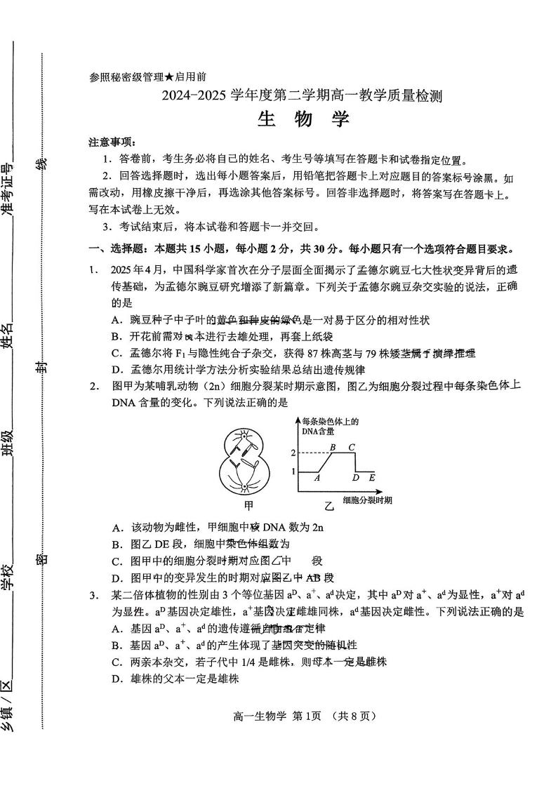 高一生物+答案--山东省淄博市2024-2025学年高一下学期期末考试