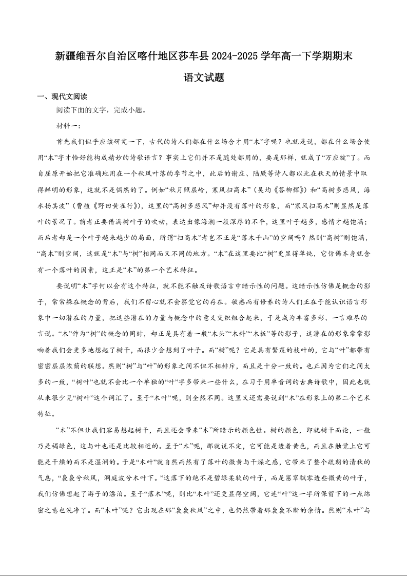 高一语文+答案--新疆喀什地区莎车县2024-2025学年高一下学期7月期末考试