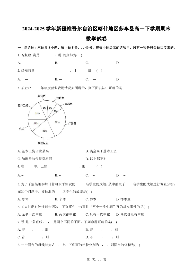 高一数学+答案--新疆喀什地区莎车县2024-2025学年高一下学期7月期末考试